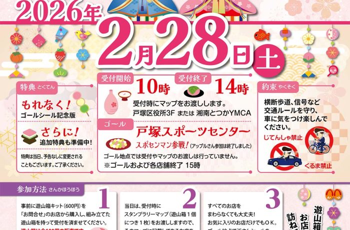 戸塚駅の東口を出ると、ペデストリアンデッキの先から柏尾川が見えてきます。柏尾川を渡った先の上倉田交差点から南側と東側の広い地域、ここが戸塚東口商店会の主なエリアになります。会員は地域の店や会社、団体で構成されています。年に3回開催する遊山箱スタンプラリーは地元住民だけでなく、近隣の街からの参加者も増え、人気の季節イベントになりました。これからも戸塚がわくわくする街になるよう活動しています。