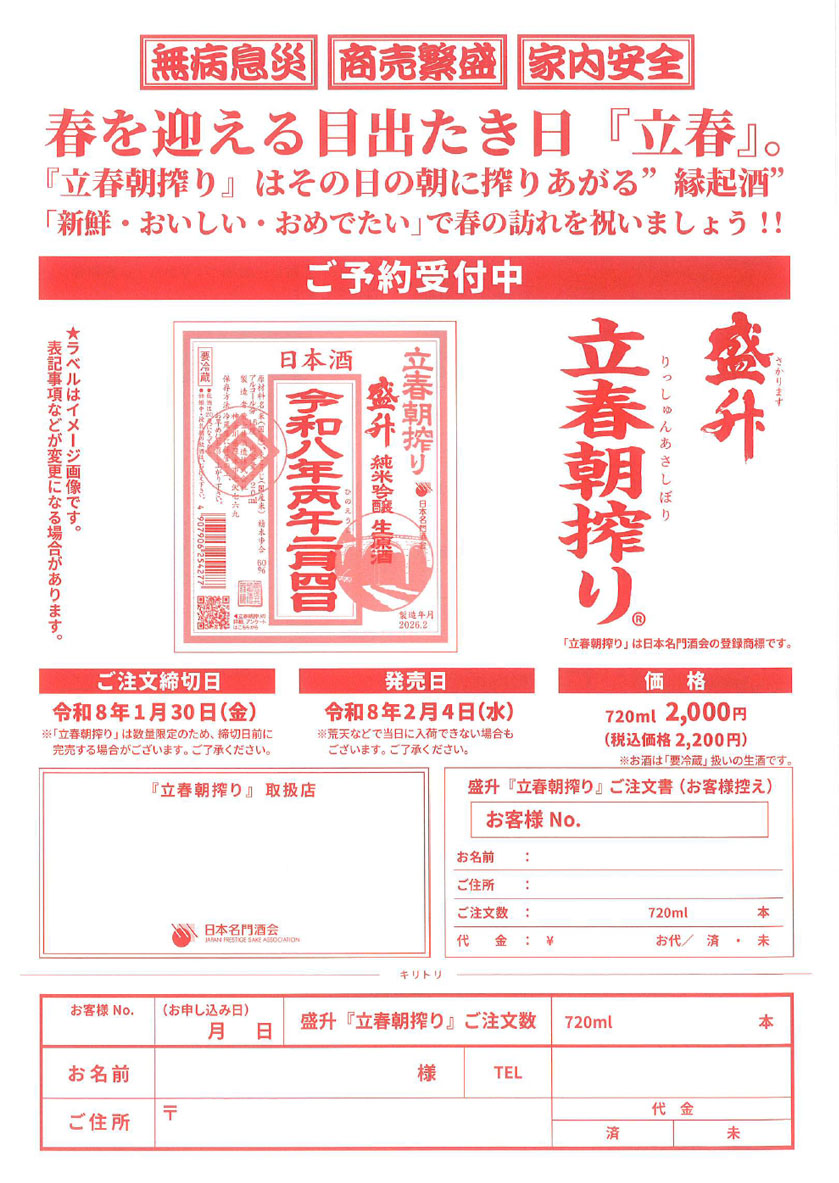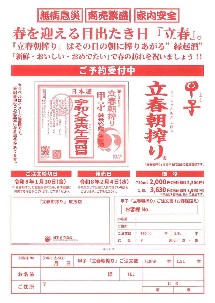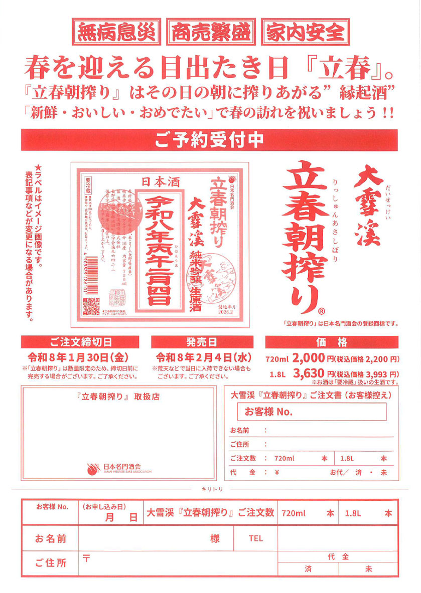 「立春朝搾り」とは、立春の朝に搾ったお酒。「立春の朝い搾り、その日のうちにお客様にお届けする」お酒です。蔵元さんが立春の日に、お酒が一番良い状態になるようにし込み、苦労を重ねて仕上げた逸品です。酒屋さんが蔵元に出かけ、搾りたてのお酒に自らラベルを貼り、神主さんのお祓いをうけ、その日のうちにお客様へお届けします。まさに立春の日だけのお酒です。